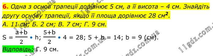 Одна з основ трапеції дорівнює 5 см, а її висота – 4 см. Знайдіть другу основу трапеції, якщо її площа дорівнює 28 см2. А. 11 см; Б. 2 см; В. 7 см; Г. 9 см. S = (a+b)/2 • h; (5+b)/2 • 4 = 28; 5 + b = 14; b = 9 (см). Відповідь: Г. 9 см.