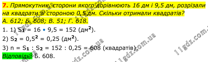 Прямокутник, сторони якого дорівнюють 16 дм і 9,5 дм, розрізали на квадрати зі стороною 0,5 дм. Скільки отримали квадратів? А. 612; Б. 608; В. 51; Г. 618. 1. 1) S1 = 16 • 9,5 = 152 (дм2). 2) S2 = 0,52 = 0,25 (дм2). 3) n = S1 : S2 = 152 : 0,25 = 608 (квадратів). Відповідь: Б. 608.