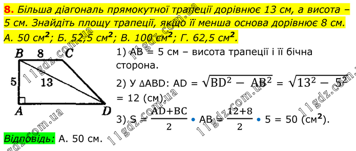 Більша діагональ прямокутної трапеції дорівнює 13 см, а висота – 5 см. Знайдіть площу трапеції, якщо її менша основа дорівнює 8 см. А. 50 см2; Б. 52,5 см2; В. 100 см2; Г. 62,5 см2. 1) АВ = 5 см – висота трапеції і її бічна сторона. 2) У ∆ABD: AD = √(BD^2- AB^2 ) = √(13^2- 5^2 ) = 12 (см). 3) S = (AD+BC)/2 • AB = (12+8)/2 • 5 = 50 (см2). Відповідь: А. 50 см.