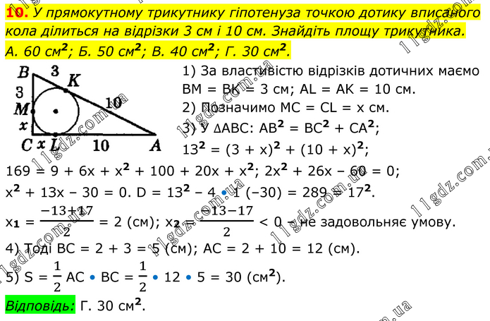 У прямокутному трикутнику гіпотенуза точкою дотику вписаного кола ділиться на відрізки 3 см і 10 см. Знайдіть площу трикутника. А. 60 см2; Б. 50 см2; В. 40 см2; Г. 30 см2. 1) За властивістю відрізків дотичних маємо BM = BK = 3 см; AL = AK = 10 см. 2) Позначимо MC = CL = х см. 3) У ∆ABC: AB2 = BC2 + CA2; 1З2 = (3 + х)2 + (10 + х)2; 169 = 9 + 6х + х2 + 100 + 20х + х2; 2х2 + 26х – 60 = 0; х2 + 1Зх – 30 = 0. D = 1З2 – 4 • 1 (–30) = 289 = 172. х1 = (-13+17)/2 = 2 (см); х2 = (-13-17)/2 < 0 – не задовольняє умову. 4) Тоді ВС = 2 + 3 = 5 (см); АС = 2 + 10 = 12 (см). 5) S = 1/2 AC • BC = 1/2 • 12 • 5 = 30 (cм2). Відповідь: Г. 30 см2.
