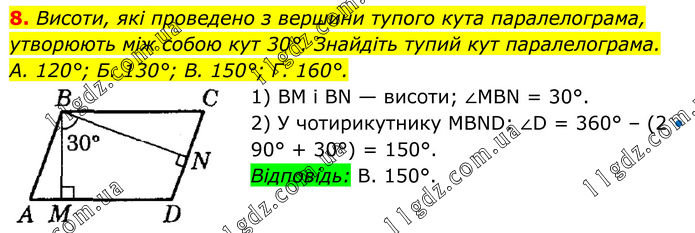 8. Висоти, які проведено з вершини тупого кута паралелограма, утворюють між собою кут 30°. Знайдіть тупий кут паралелограма. А. 120°; Б. 130°; В. 150°; Г. 160°. 1) BM і BN — висоти; ∠MBN = 30°. 2) У чотирикутнику MBND: ∠D = 360° – (2 • 90° + 30°) = 150°. Відповідь: В. 150°.
