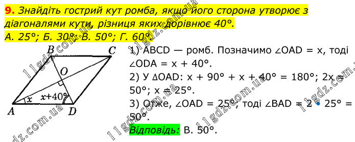 9. Знайдіть гострий кут ромба, якщо його сторона утворює з діагоналями кути, різниця яких дорівнює 40°. А. 25°; Б. 30°; В. 50°; Г. 60°. 1) ABCD — ромб. Позначимо ∠OAD = х, тоді ∠ODA = х + 40°. 2) У ∆OAD: х + 90° + х + 40° = 180°; 2х = 50°; х = 25°. 3) Отже, ∠OAD = 25°; тоді ∠BAD = 2 • 25° = 50°. Відповідь: В. 50°.