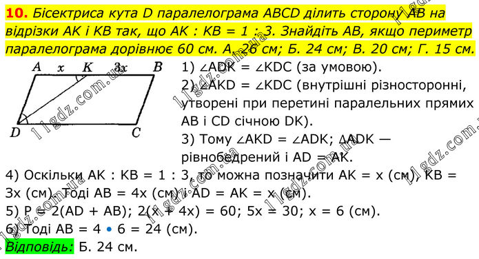 10. Бісектриса кута D паралелограма ABCD ділить сторону AB на відрізки AK і KB так, що AK : KB = 1 : 3. Знайдіть AB, якщо периметр паралелограма дорівнює 60 см. А. 26 см; Б. 24 см; В. 20 см; Г. 15 см. 1) ∠ADK = ∠KDC (за умовою). 2) ∠AKD = ∠KDC (внутрішні різносторонні, утворені при перетині паралельних прямих AB і CD січною DK). 3) Тому ∠AKD = ∠ADK; ∆ADK — рівнобедрений і AD = AK. 4) Оскільки AK : KB = 1 : 3, то можна позначити AK = х (см), KB = Зх (см). Тоді AB = 4х (см) і AD = AK = х (см). 5) P = 2(AD + AB); 2(х + 4х) = 60; 5х = 30; х = 6 (см). 6) Тоді AB = 4 • 6 = 24 (см). Відповідь: Б. 24 см.