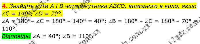 4. Знайдіть кути A і B чотирикутника ABCD, вписаного в коло, якщо ∠C = 140°, ∠D = 70°. ∠A = 180°– ∠C = 180° – 140° = 40°; ∠B = 180° – ∠D = 180° – 70° = 110°. Відповідь: ∠A = 40°; ∠B = 110°.