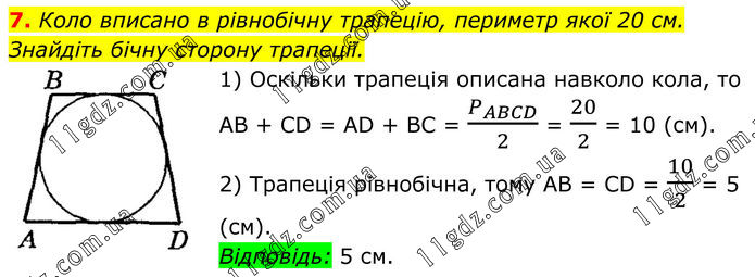 7. Коло вписано в рівнобічну трапецію, периметр якої 20 см. Знайдіть бічну сторону трапеції. 1) Оскільки трапеція описана навколо кола, то AB + CD = AD + BC = P_ABCD/2 = 20/2 = 10 (см). 2) Трапеція рівнобічна, тому AB = CD = 10/2 = 5 (см). Відповідь: 5 см.