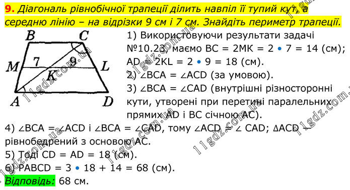 9. Діагональ рівнобічної трапеції ділить навпіл її тупий кут, а середню лінію – на відрізки 9 см і 7 см. Знайдіть периметр трапеції. 1) Використовуючи результати задачі №10.23, маємо ВС = 2МК = 2 • 7 = 14 (см); AD = 2KL = 2 • 9 = 18 (см). 2) ∠BCA = ∠ACD (за умовою). 3) ∠BCA = ∠CAD (внутрішні різносторонні кути, утворені при перетині паралельних прямих AD і BC січною AC). 4) ∠BCA = ∠ACD і ∠BCA = ∠CAD, тому ∠ACD = ∠ CAD; ∆ACD — рівнобедрений з основою AC. 5) Тоді CD = AD = 18 (см). 6) PABCD = 3 • 18 + 14 = 68 (см). Відповідь: 68 см.