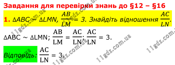 Завдання для перевірки знань до §12 – §16 1. ∆ABC ~ ∆LMN, AB/LM = 3. Знайдіть відношення AC/LN. ∆ABC ~ ∆LMN; AB/LM = AC/LN; AC/LN = 3. Відповідь: AC/LN = 3.