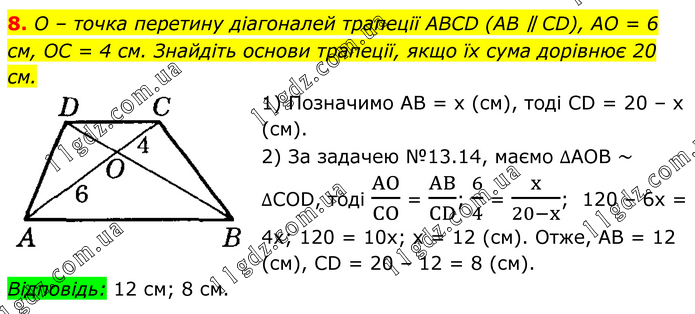 8. O – точка перетину діагоналей трапеції ABCD (AB ∥ CD), AO = 6 см, OC = 4 см. Знайдіть основи трапеції, якщо їх сума дорівнює 20 см. 1) Позначимо AB = х (см), тоді CD = 20 – х (см). 2) За задачею №13.14, маємо ∆AOB ~ ∆COD, тоді AO/CO = AB/CD; 6/4 = x/(20-x); 120 – 6х = 4х; 120 = 10х; х = 12 (см). Отже, AB = 12 (см), CD = 20 – 12 = 8 (см). Відповідь: 12 см; 8 см.