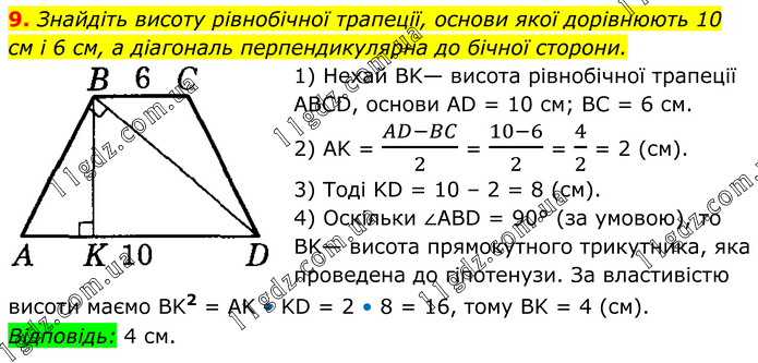 9. Знайдіть висоту рівнобічної трапеції, основи якої дорівнюють 10 см і 6 см, а діагональ перпендикулярна до бічної сторони. 1) Нехай BK— висота рівнобічної трапеції ABCD, основи AD = 10 cм; BC = 6 см. 2) AK = (AD-BC)/2 = (10-6)/2 = 4/2 = 2 (см). 3) Тоді KD = 10 – 2 = 8 (см). 4) Оскільки ∠ABD = 90° (за умовою), то BK— висота прямокутного трикутника, яка проведена до гіпотенузи. За властивістю висоти маємо BK2 = AK • KD = 2 • 8 = 16, тому BK = 4 (см). Відповідь: 4 см.