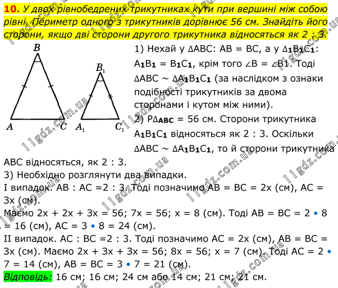 У двох рівнобедрених трикутниках кути при вершині між собою рівні. Периметр одного з трикутників дорівнює 56 см. Знайдіть його сторони, якщо дві сторони другого трикутника відносяться як 2 : 3. 1) Нехай у ∆ABC: AB = BC, а у ∆1B1C1: A1B1 = B1C1, крім того ∠B = ∠B1. Тоді ∆ABC ~ ∆A1B1C1 (за наслідком з ознаки подібності трикутників за двома сторонами і кутом між ними). 2) P∆ABC = 56 см. Сторони трикутника A1B1C1 відносяться як 2 : 3. Оскільки ∆ABC ~ ∆A1B1C1, то й сторони трикутника ABC відносяться, як 2 : 3. 3) Необхідно розглянути два випадки. I випадок. AB : AC =2 : 3. Тоді позначимо AB = BC = 2х (см), AC = Зх (см). Маємо 2х + 2х + Зх = 56; 7x = 56; х = 8 (см). Тоді AB = BC = 2 • 8 = 16 (см), AC = 3 • 8 = 24 (см). II випадок. AC : BC =2 : 3. Тоді позначимо AC = 2х (см), AB = BC = Зх (см). Маємо 2х + Зх + Зх = 56; 8х = 56; х = 7 (см). Тоді AC = 2 • 7 = 14 (см), AB = BC = 3 • 7 = 21 (см). Відповідь: 16 см; 16 см; 24 см або 14 см; 21 см; 21 см.