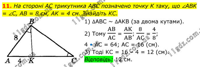 На стороні AC трикутника ABC позначено точку K таку, що ∠ABK = ∠С, AB = 8 см, AK = 4 см. Знайдіть KC. 1) ∆ABC ~ ∆AKB (за двома кутами). 2) Тому AB/AC = AK/AB; 8/AC = 4/8; 4 • AC = 64; AC = 16 (см). 3) Тоді KC = 16 – 4 = 12 (см). Відповідь: 12 см.
