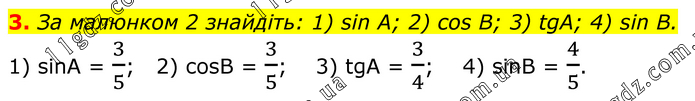 3. За малюнком 2 знайдіть: 1) sin A; 2) cos B; 3) tgA; 4) sin B. 1) sinA = 3/5; 2) cosB = 3/5; 3) tgA = 3/4; 4) sinB = 4/5.