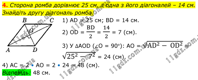 Сторона ромба дорівнює 25 см, а одна з його діагоналей – 14 см. Знайдіть другу діагональ ромба. 1) AD = 25 см; BD = 14 см. 2) OD = BD/2 = 14/2 = 7 (см). 3) У ∆AOD (∠O = 90°): AO = √(AD^2- OD^2 ) = √(25^2- 7^2 ) = 24 (см). 4) АС = 2 • АО = 2 • 24 = 48 (см). Відповідь: 48 см.