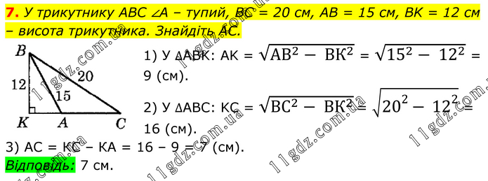 У трикутнику ABC ∠A – тупий, BC = 20 см, AB = 15 см, BK = 12 см – висота трикутника. Знайдіть AC. 1) У ∆ABK: AK = √(〖АВ〗^2- 〖ВК〗^2 ) = √(15^2- 12^2 ) = 9 (см). 2) У ∆ABC: KC = √(〖ВС〗^2- 〖ВК〗^2 ) = √(20^2- 12^2 ) = 16 (см). 3) AC = КС – КA = 16 – 9 = 7 (см). Відповідь: 7 см.