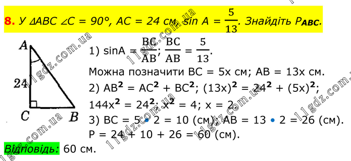 У ∆ABC ∠C = 90°, AC = 24 см, sin А = 5/13. Знайдіть PABC. 1) sinA = BC/AB; BC/AB = 5/13. Можна позначити ВС = 5х см; AB = 13x см. 2) AB2 = AC2 + BC2; (13х)2 = 242 + (5х)2; 144х2 = 242; х2 = 4; х = 2. 3) BC = 5 • 2 = 10 (см); AB = 13 • 2 = 26 (см). Р = 24 + 10 + 26 = 60 (см). Відповідь: 60 см.