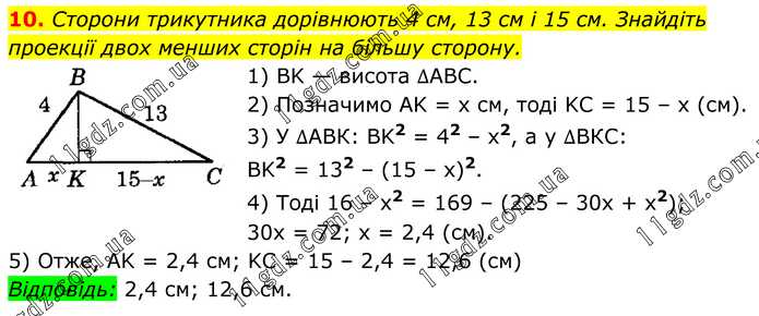 Сторони трикутника дорівнюють 4 см, 13 см і 15 см. Знайдіть проекції двох менших сторін на більшу сторону. 1) BK — висота ∆ABC. 2) Позначимо AK = х см, тоді KC = 15 – х (см). 3) У ∆АВК: BK2 = 42 – х2, а у ∆ВКС: BK2 = 132 – (15 – х)2. 4) Тоді 16 – х2 = 169 – (225 – 30х + х2); 30х = 72; х = 2,4 (см). 5) Отже, AK = 2,4 см; KC = 15 – 2,4 = 12,6 (см) Відповідь: 2,4 см; 12,6 см.