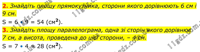 2. Знайдіть площу прямокутника, сторони якого дорівнюють 6 см і 9 см. S = 6 • 9 = 54 (см2). 3. Знайдіть площу паралелограма, одна зі сторін якого дорівнює 7 см, а висота, проведена до цієї сторони, – 4 см. S = 7 • 4 = 28 (см2).