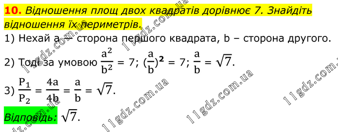 Відношення площ двох квадратів дорівнює 7. Знайдіть відношення їх периметрів. 1) Нехай а — сторона першого квадрата, b – сторона другого. 2) Тоді за умовою a^2/b^2 = 7; (a/b)2 = 7; a/b = √7. 3) P_1/P_2 = 4a/4b = a/b = √7. Відповідь: √7.