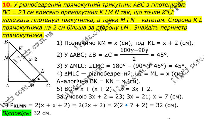 10. У рівнобедрений прямокутний трикутник ABC з гіпотенузою BC = 23 см вписано прямокутник K LM N так, що точки K і L належать гіпотенузі трикутника, а точки M і N – катетам. Сторона K L прямокутника на 2 см більша за сторону LM . Знайдіть периметр прямокутника. 1) Позначимо KM = х (см), тоді KL = х + 2 (см). 2) У ∆АВС; ∠B = ∠C = (180γ-90γ)/2 = 45°. 3) У ∆MLC: ∠LMC = 180° – (90° + 45°) = 45°. 4) ∆MLC — рівнобедрений; LC = ML = х (см). Аналогічно BK = KN = х (см). 5) BC = х + (х + 2) + х = Зх + 2. За умовою Зх + 2 = 23; Зх = 21; х = 7 (см). 6) PKLMN = 2(х + х + 2) = 2(2х + 2) = 2(2 • 7 + 2) = 32 (см). Відповідь: 32 см.