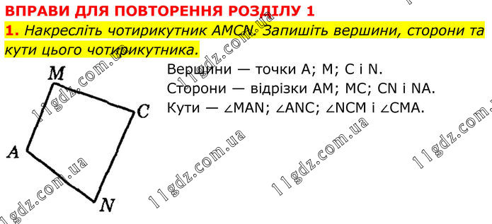 ВПРАВИ ДЛЯ ПОВТОРЕННЯ РОЗДІЛУ 1 1. Накресліть чотирикутник AMCN. Запишіть вершини, сторони та кути цього чотирикутника. Вершини — точки А; М; C i N. Сторони — відрізки AM; MC; CN і NA. Кути — ∠MAN; ∠ANC; ∠NCM і ∠CMA.