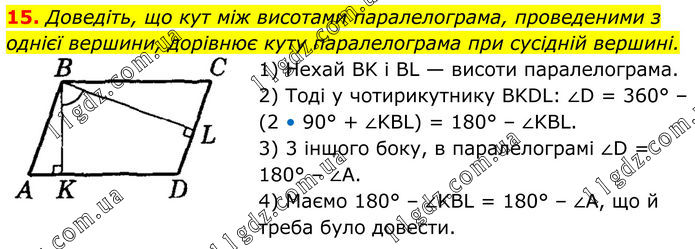 15. Доведіть, що кут між висотами паралелограма, проведеними з однієї вершини, дорівнює куту паралелограма при сусідній вершині. 1) Нехай BK і BL — висоти паралелограма. 2) Тоді у чотирикутнику BKDL: ∠D = 360° – (2 • 90° + ∠KBL) = 180° – ∠KBL. 3) 3 іншого боку, в паралелограмі ∠D = 180° – ∠A. 4) Маємо 180° – ∠KBL = 180° – ∠A, що й треба було довести.