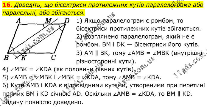16. Доведіть, що бісектриси протилежних кутів паралелограма або паралельні, або збігаються. 1) Якщо паралелограм є ромбом, то бісектриси протилежних кутів збігаються. 2) Розглянемо паралелограм, який не є ромбом. BM і DK — бісектриси його кутів. 3) AM ∥ BK, тому ∠AMB = ∠MBK (внутрішні різносторонні кути). 4) ∠MBK = ∠KDA (як половини рівних кутів). 5) ∠AMB = ∠MBK i ∠MBK = ∠KDА, тому ∠AMB = ∠KDA. 6) Кути AMB і KDA є відповідними кутами, утвореними при перетині прямих BM і KD січною AD. Оскільки ∠AMB = ∠KDA, то BM ∥ KD. Задачу повністю доведено.