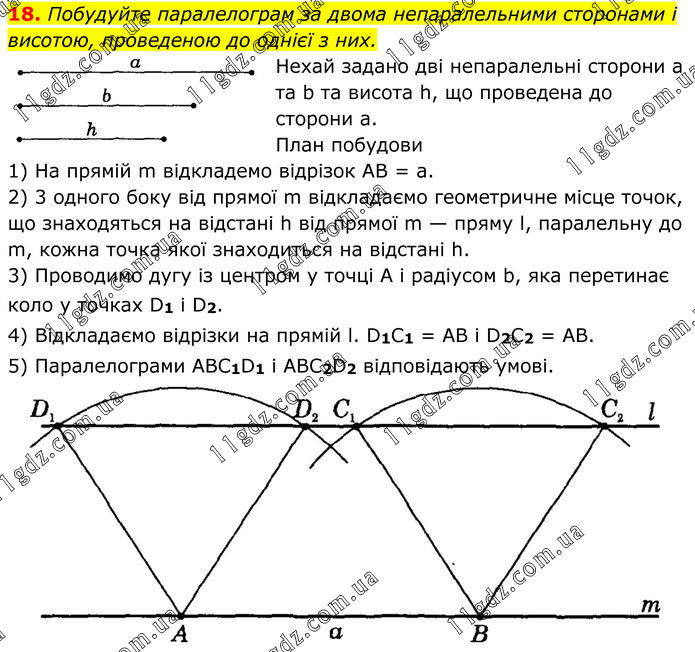18. Побудуйте паралелограм за двома непаралельними сторонами і висотою, проведеною до однієї з них. Нехай задано дві непаралельні сторони а та b та висота h, що проведена до сторони а. План побудови 1) На прямій m відкладемо відрізок AB = а. 2) 3 одного боку від прямої m відкладаємо геометричне місце точок, що знаходяться на відстані h від прямої m — пряму l, паралельну до m, кожна точка якої знаходиться на відстані h. 3) Проводимо дугу із центром у точці А і радіусом b, яка перетинає коло у точках D1 і D2. 4) Відкладаємо відрізки на прямій l. D1C1 = AB і D2C2 = AB. 5) Паралелограми ABC1D1 і ABC2D2 відповідають умові.