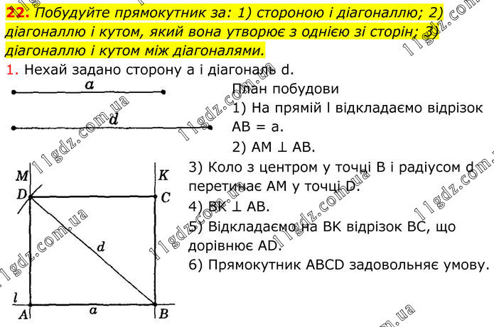 22. Побудуйте прямокутник за: 1) стороною і діагоналлю; 2) діагоналлю і кутом, який вона утворює з однією зі сторін; 3) діагоналлю і кутом між діагоналями. 1. Нехай задано сторону а і діагональ d. План побудови 1) На прямій l відкладаємо відрізок AB = а. 2) АМ ⊥ АВ. 3) Коло з центром у точці В і радіусом d перетинає AM y точці D. 4) BK ⊥ AB. 5) Відкладаємо на BK відрізок BC, що дорівнює AD. 6) Прямокутник ABCD задовольняє умову.