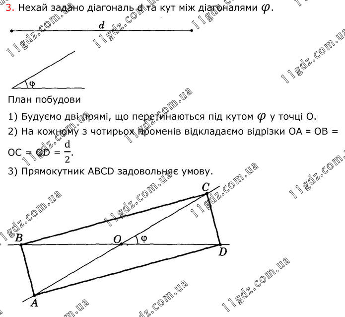 3. Нехай задано діагональ d та кут між діагоналями φ. План побудови 1) Будуємо дві прямі, що перетинаються під кутом φ у точці О. 2) На кожному з чотирьох променів відкладаємо відрізки OA = OB = OC = OD = d/2. 3) Прямокутник ABCD задовольняє умову.