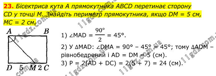 23. Бісектриса кута A прямокутника ABCD перетинає сторону CD у точці M. Знайдіть периметр прямокутника, якщо DM = 5 см, MC = 2 см. 1) ∠MAD = (90°)/2 = 45°. 2) У ∆MAD: ∠DMA = 90° – 45° = 45°; тому ∆ADM – рівнобедрений і AD = DM = 5 (см). 3) P = 2(AD + DС) = 2(5 + 7) = 24 (см).