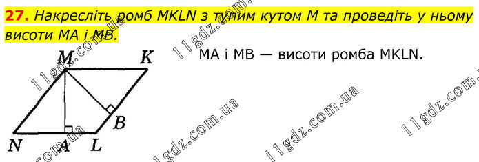 27. Накресліть ромб MKLN з тупим кутом M та проведіть у ньому висоти MA і MB. MA і MB — висоти ромба MKLN.