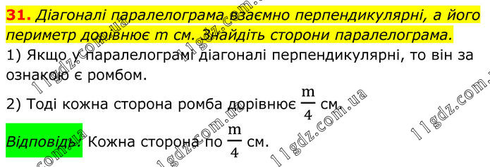 31. Діагоналі паралелограма взаємно перпендикулярні, а його периметр дорівнює m см. Знайдіть сторони паралелограма. 1) Якщо у паралелограмі діагоналі перпендикулярні, то він за ознакою є ромбом. 2) Тоді кожна сторона ромба дорівнює m/4 см. Відповідь: Кожна сторона по m/4 см.