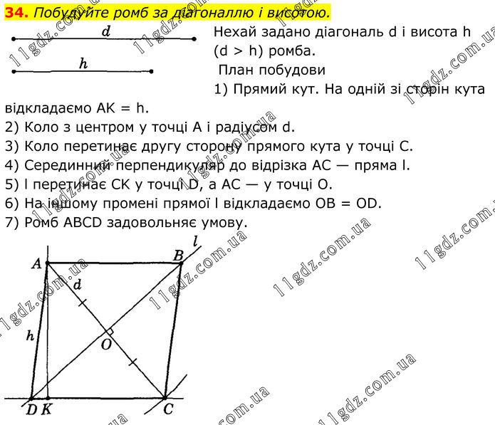 34. Побудуйте ромб за діагоналлю і висотою. Нехай задано діагональ d і висота h (d > h) ромба. План побудови 1) Прямий кут. На одній зі сторін кута відкладаємо AK = h. 2) Коло з центром у точці А і радіусом d. 3) Коло перетинає другу сторону прямого кута у точці С. 4) Серединний перпендикуляр до відрізка AC — пряма l. 5) l перетинає CK у точці D, а AC — у точці О. 6) На іншому промені прямої l відкладаємо OB = OD. 7) Ромб ABCD задовольняє умову.