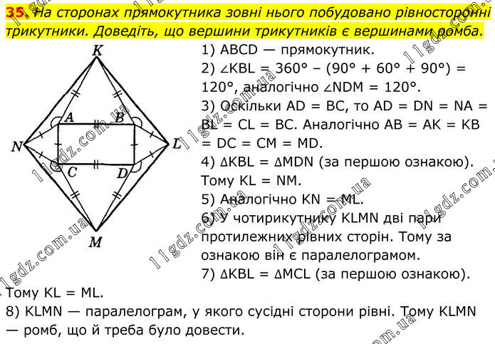35. На сторонах прямокутника зовні нього побудовано рівносторонні трикутники. Доведіть, що вершини трикутників є вершинами ромба. 1) ABCD — прямокутник. 2) ∠KBL = 360° – (90° + 60° + 90°) = 120°, аналогічно ∠NDM = 120°. 3) Оскільки AD = BC, то AD = DN = NA = BL = CL = BC. Аналогічно AB = AK = KB = DC = CM = MD. 4) ∆KBL = ∆MDN (за першою ознакою). Тому KL = NM. 5) Аналогічно KN = ML. 6) У чотирикутнику KLMN дві пари протилежних рівних сторін. Тому за ознакою він є паралелограмом. 7) ∆KBL = ∆MCL (за першою ознакою). Тому KL = ML. 8) KLMN — паралелограм, у якого сусідні сторони рівні. Тому KLMN — ромб, що й треба було довести.