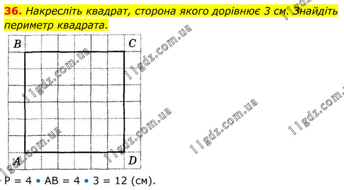 36. Накресліть квадрат, сторона якого дорівнює 3 см. Знайдіть периметр квадрата. P = 4 • AB = 4 • 3 = 12 (см).