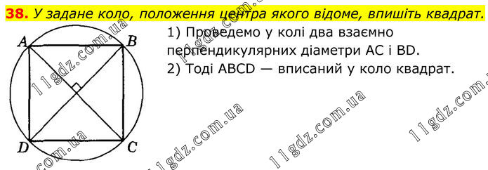 38. У задане коло, положення центра якого відоме, впишіть квадрат. 1) Проведемо у колі два взаємно перпендикулярних діаметри AC і BD. 2) Тоді ABCD — вписаний у коло квадрат.