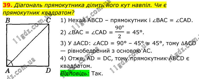 39. Діагональ прямокутника ділить його кут навпіл. Чи є прямокутник квадратом? 1) Нехай ABCD – прямокутник і ∠BAC = ∠CAD. 2) ∠BAC = ∠CAD = (90°)/2 = 45°. 3) У ∆ACD: ∠ACD = 90° – 45° = 45°, тому ∆ACD — рівнобедрений з основою AC. 4) Отже, AD = DC, тому прямокутник ABCD є квадратом. Відповідь: Так.
