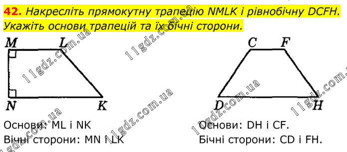 42. Накресліть прямокутну трапецію NMLK і рівнобічну DCFH. Укажіть основи трапецій та їх бічні сторони. Основи: ML і NK Вічні сторони: MN і LK Основи: DH і CF. Бічні сторони: CD і FH.