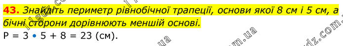 43. Знайдіть периметр рівнобічної трапеції, основи якої 8 см і 5 см, а бічні сторони дорівнюють меншій основі. P = 3 • 5 + 8 = 23 (см).
