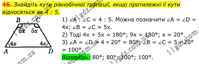 46. Знайдіть кути рівнобічної трапеції, якщо протилежні її кути відносяться як 4 : 5. 1) ∠A : ∠C = 4 : 5. Можна позначити ∠A = ∠D = 4х; ∠B = ∠C = 5х. 2) Тоді 4х + 5х = 180°; 9х = 180°; х = 20°. 3) ∠A = ∠D = 4 • 20° = 80°; ∠B = ∠C = 5 • 20° = 100°. Відповідь: 80°; 80°; 100°; 100°.