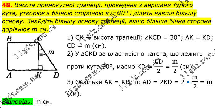 48. Висота прямокутної трапеції, проведена з вершини тупого кута, утворює з бічною стороною кут 30° і ділить навпіл більшу основу. Знайдіть більшу основу трапеції, якщо більша бічна сторона дорівнює m см. 1) CK — висота трапеції; ∠KCD = 30°; AK = KD; CD = m (см). 2) У ∆CKD за властивістю катета, що лежить проти кута 30°, маємо KD = CD/2 = m/2 (см). 3) Оскільки AK = KD, то AD = 2KD = 2 • m/2 = m (см). Відповідь: m см.