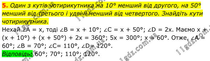 5. Один з кутів чотирикутника на 10° менший від другого, на 50° менший від третього і удвічі менший від четвертого. Знайдіть кути чотирикутника. Нехай ∠A = х, тоді ∠B = х + 10°; ∠C = х + 50°; ∠D = 2х. Маємо х + (х + 10°) + (х + 50°) + 2х = 360°; 5х = 300°; х = 60°. Отже, ∠A = 60°; ∠B = 70°; ∠C= 110°, ∠D= 120°. Відповідь: 60°; 70°; 110°; 120°.