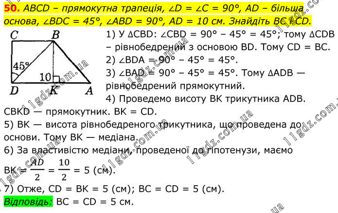 50. ABCD – прямокутна трапеція, ∠D = ∠C = 90°, AD – більша основа, ∠BDC = 45°, ∠ABD = 90°, AD = 10 см. Знайдіть BC і CD. 1) У ∆CBD: ∠CBD = 90° – 45° = 45°; тому ∆CDB – рівнобедрений з основою BD. Тому CD = BC. 2) ∠BDA = 90° – 45° = 45°. 3) ∠BAD = 90° – 45° = 45°. Тому ∆ADB — рівнобедрений прямокутний. 4) Проведемо висоту BK трикутника ADB. CBKD — прямокутник. BK = CD. 5) BK — висота рівнобедреного трикутника, що проведена до основи. Тому BK — медіана. 6) За властивістю медіани, проведеної до гіпотенузи, маємо BK = AD/2 = 10/2 = 5 (см). 7) Отже, CD = BK = 5 (см); BC = CD = 5 (см). Відповідь: BC = CD = 5 см.