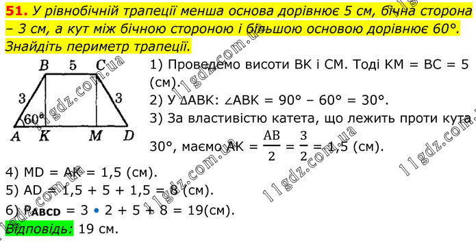 51. У рівнобічній трапеції менша основа дорівнює 5 см, бічна сторона – 3 см, а кут між бічною стороною і більшою основою дорівнює 60°. Знайдіть периметр трапеції. 1) Проведемо висоти BK і CM. Тоді KM = BC = 5 (см). 2) У ∆ABK: ∠ABK = 90° – 60° = 30°. 3) За властивістю катета, що лежить проти кута 30°, маємо AK = АВ/2 = 3/2 = 1,5 (см). 4) MD = AK = 1,5 (см). 5) AD = 1,5 + 5 + 1,5 = 8 (см). 6) РABCD = 3 • 2 + 5 + 8 = 19(см). Відповідь: 19 см.