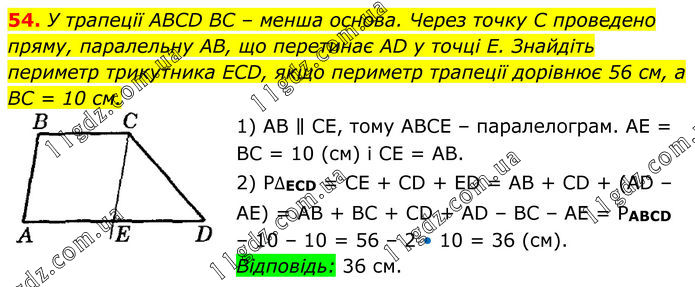 54. У трапеції ABCD BC – менша основа. Через точку C проведено пряму, паралельну AB, що перетинає AD у точці E. Знайдіть периметр трикутника ECD, якщо периметр трапеції дорівнює 56 см, а BC = 10 см. 1) AB ∥ CE, тому ABCE – паралелограм. AE = BC = 10 (см) і CE = AB. 2) P∆ЕCD = CE + CD + ED = AB + CD + (AD – AE) = AB + BC + CD + AD – BC – AE = PABCD – 10 – 10 = 56 – 2 • 10 = 36 (см). Відповідь: 36 см.