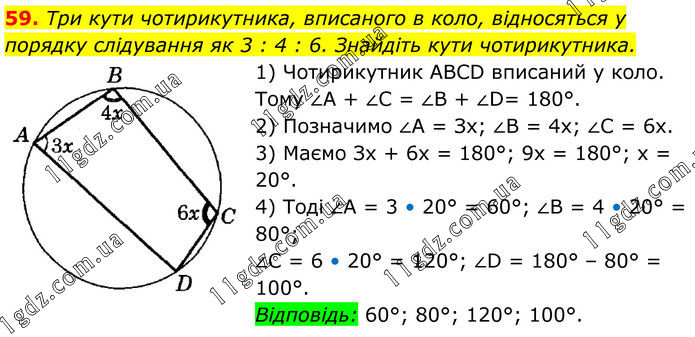 59. Три кути чотирикутника, вписаного в коло, відносяться у порядку слідування як 3 : 4 : 6. Знайдіть кути чотирикутника. 1) Чотирикутник ABCD вписаний у коло. Тому ∠A + ∠C = ∠B + ∠D= 180°. 2) Позначимо ∠A = Зх; ∠B = 4x; ∠C = 6x. 3) Маємо Зх + 6x = 180°; 9х = 180°; х = 20°. 4) Тоді ∠A = 3 • 20° = 60°; ∠B = 4 • 20° = 80°; ∠C = 6 • 20° = 120°; ∠D = 180° – 80° = 100°. Відповідь: 60°; 80°; 120°; 100°.