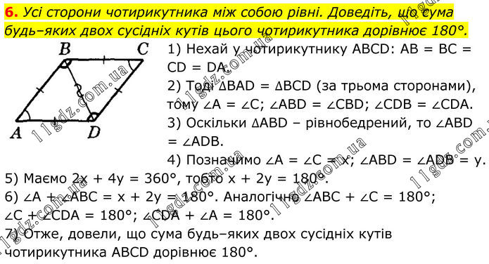 6. Усі сторони чотирикутника між собою рівні. Доведіть, що сума будь–яких двох сусідніх кутів цього чотирикутника дорівнює 180°. 1) Нехай у чотирикутнику ABCD: AB = BC = CD = DA. 2) Тоді ∆BAD = ∆BCD (за трьома сторонами), тому ∠A = ∠C; ∠ABD = ∠CBD; ∠CDB = ∠CDA. 3) Оскільки ∆ABD – рівнобедрений, то ∠ABD = ∠ADB. 4) Позначимо ∠A = ∠C = х; ∠ABD = ∠ADB = у. 5) Маємо 2х + 4у = 360°, тобто х + 2у = 180°. 6) ∠A + ∠ABC = х + 2у = 180°. Аналогічно ∠ABC + ∠C = 180°; ∠C + ∠CDA = 180°; ∠CDA + ∠A = 180°. 7) Отже, довели, що сума будь–яких двох сусідніх кутів чотирикутника ABCD дорівнює 180°.
