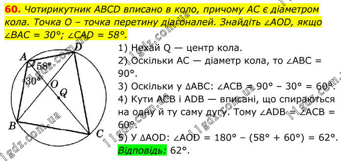 60. Чотирикутник ABCD вписано в коло, причому AC є діаметром кола. Точка O – точка перетину діагоналей. Знайдіть ∠AOD, якщо ∠BAC = 30°; ∠CAD = 58°. 1) Нехай Q — центр кола. 2) Оскільки AC — діаметр кола, то ∠ABC = 90°. 3) Оскільки у ∆АВС: ∠ACB = 90° – 30° = 60°. 4) Кути ACB і ADB — вписані, що спираються на одну й ту саму дугу. Тому ∠ADB = ∠ACB = 60°. 5) У ∆AOD: ∠AOD = 180° – (58° + 60°) = 62°. Відповідь: 62°.
