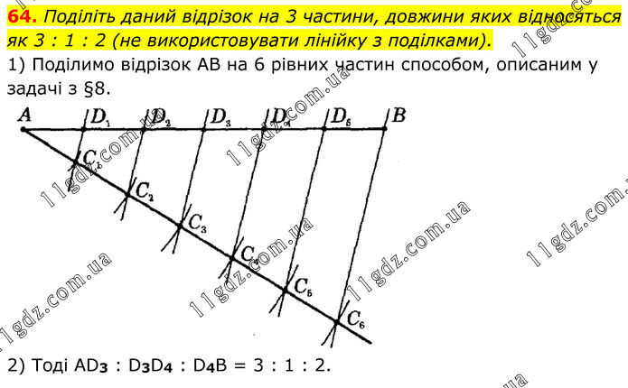 64. Поділіть даний відрізок на 3 частини, довжини яких відносяться як 3 : 1 : 2 (не використовувати лінійку з поділками). 1) Поділимо відрізок AB на 6 рівних частин способом, описаним у задачі з §8. 2) Тоді AD3 : D3D4 : D4B = 3 : 1 : 2.