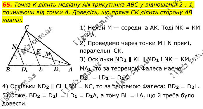 65. Точка K ділить медіану AN трикутника ABC у відношенні 2 : 1, починаючи від точки A. Доведіть, що пряма CK ділить сторону AB навпіл. 1) Нехай M — середина AK. Тоді NK = KM = MA. 2) Проведемо через точки M i N прямі, паралельні CK. 3) Оскільки ND2 ∥ KL ∥ MD1 і NK = KM = MA1, то за теоремою Фалеса маємо D2L = LD1 = D1A. 4) Оскільки ND2 ∥ CL i BN = NC, то за теоремою Фалеса: BD2 = D2L. 5) Отже, BD2 = D2L = LD1 = D1A, а тому BL = LA, що й треба було довести.